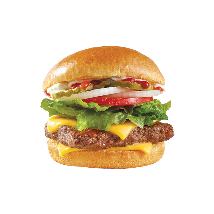 Large 100% pure beef patty, slices of cheese, mayonnaise, ketchup, pickles, onion, tomato and lettuce on a toasted glazed bun.