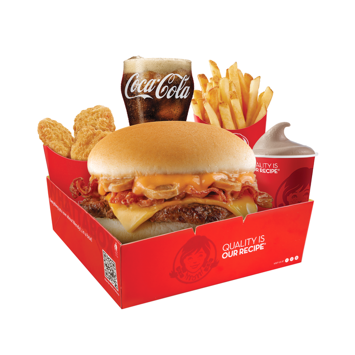Full meal with Bacon mushroom melt, 3 pcs nuggets, regular frosty, regular fries & drink.
